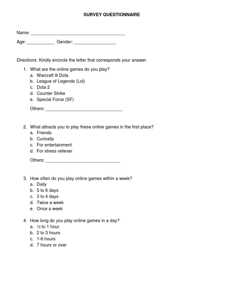 Survey Online Games Questionnaire / 1 : From there, develop questions that are in line with your.. The data is stored in a database and the survey tool generally provides some level of analysis of the data in addition to. Zoho survey's online questionnaire tool promises that you achieve better customer insights within days of using it! Sign in to follow this. Gaming motives are potentially salient factors of igd, but research on chinese gaming motives is scarce. Please just click on the appropriate icon to launch your survey.